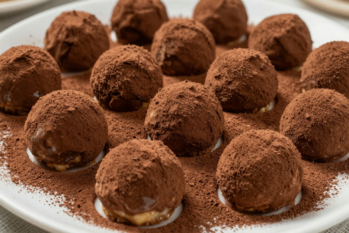Una volta pronto il composto, passiamo a formare le palline. Con le mani leggermente umide, prendete piccole porzioni di impasto e modellatele fino a ottenere delle palline della grandezza di una noce. E così passaggio è fondamentale: le palline devono essere ben compatte per evitare che si rompano durante la decorazione. Sapete qual è l’errore comune? L’ho fatto anch’io molte volte. Si tende a pensare che più cacao si aggiunge, più buoni saranno i tartufi. In realtà, è meglio non esagerare: una copertura leggera di cacao è già sufficiente per esaltare il dolce senza coprirne il sapore. E quindi? Meno è a volte più, specialmente in pasticceria.